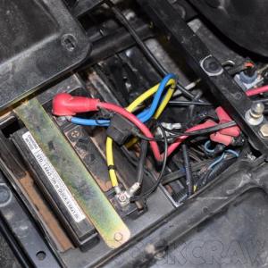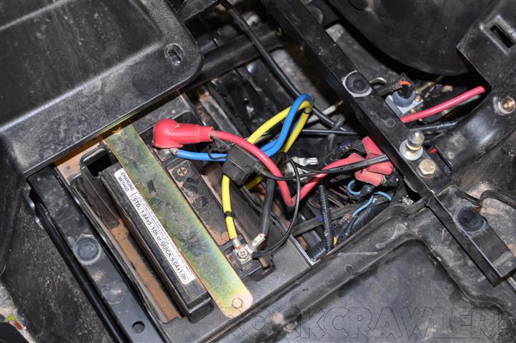 The final step is running the two cables to the battery. I know a few folks have zip-tied these to the radiator lines, but I opted to instead allow them to rest on the skid plate…they are zip-tied to the front tube on the firewall and run inside a few underside mounts points…there is nothing under there for them to contact, unless the skid plate is completely torn away. Note that I opted to removed center console to gain access…you can see the front driveshaft there, the cables rest a few inches below that. DO NOT zip tie to the shaft…seriously…lol