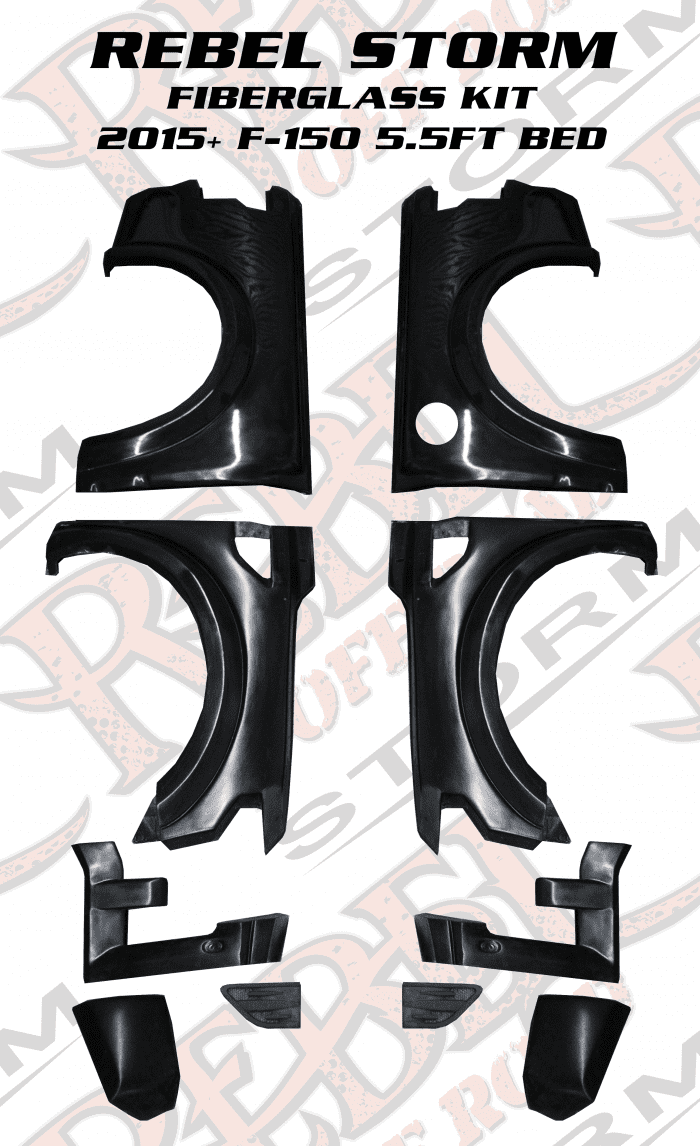 Introducing the Rebel Storm fiberglass body panel kits. Transform your stock F-150 into a one-of-a-kind off road rig, with function and form to set you aside from the rest. Fit larger tires and/or longer travel suspension and allow for plenty of more wheel travel with these fenders and bedsides. These desert racing inspired kits are currently available for the 2009-2015 Ford F-150, with a standard 5.5ft bed. These body panels are designed and manufactured in the USA, with ease of installation and OEM fitment in mind. These panels are the only fiberglass fenders that fit just like the OEM Ford fenders. Those beautiful factory body lines will line up flawlessly with these new panels to look like a factory manufactured part only with a lot more attitude. Factory headlights, tail lights and fuel door will fit with these fiberglass panels with no modification required. The fiberglass comes in a black gel-coat, ready for primer and paint. Some minimal sanding may be required. Bedsides and valance come with indents for marker lights (sold separately). Front fenders have recessed cut outs for OEM Raptor side vents, or available STORM side vents (sold separately). Factory fuel door can be utilized with fiberglass bedsides. Sold as a kit to outfit one truck.