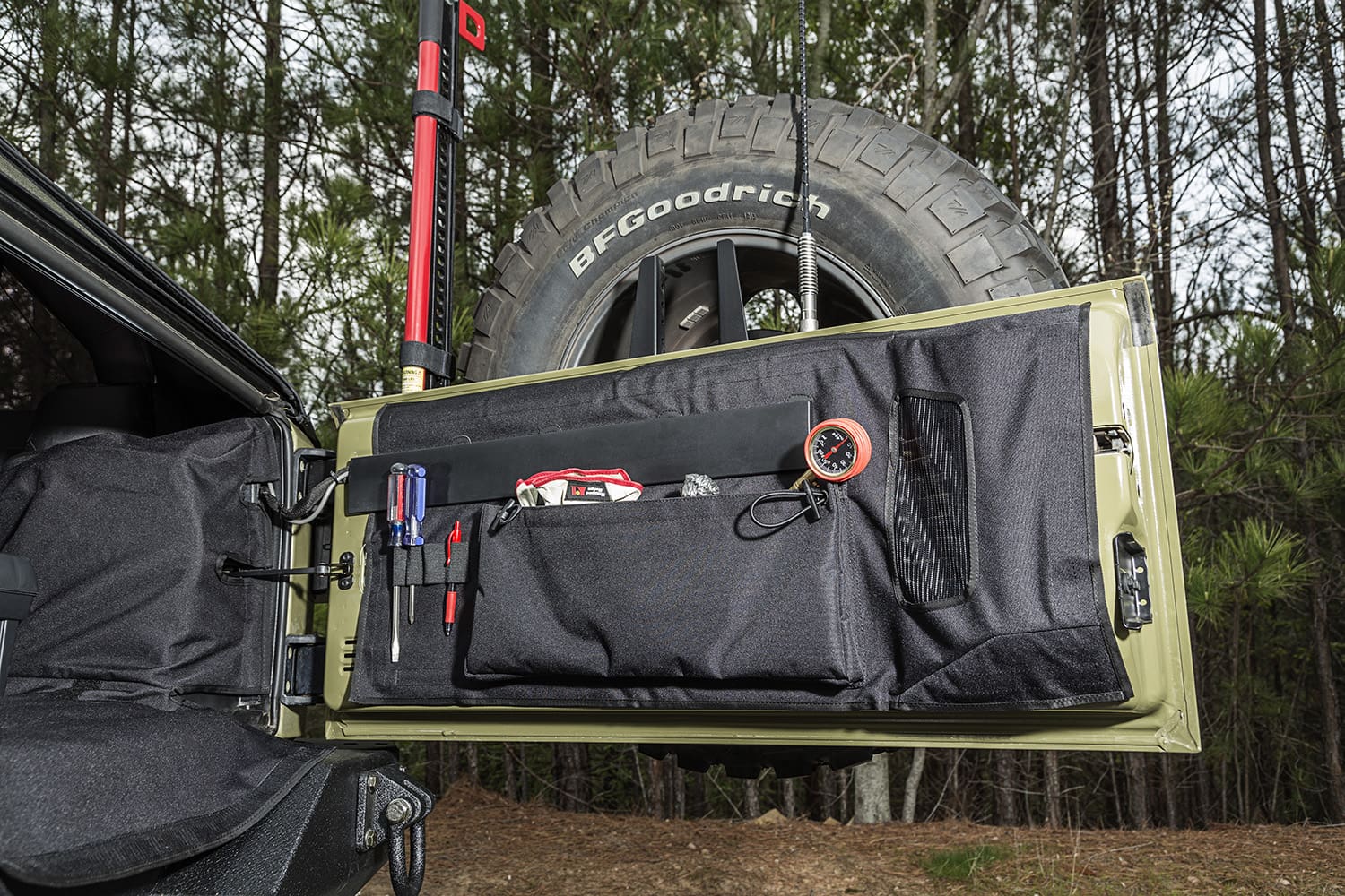 The C3 Interior Tailgate Cover is constructed of heavyweight ballistic-weave nylon with sturdy reinforced seams. It incorporates a spacious storage pouch and multiple tool loops for added utility. A built-in mesh screen maintains proper air flow through the factory tailgate vent. Installation is simplified with the included hook and loop fasteners for all 2007-2018 Jeep Wrangler JK models.