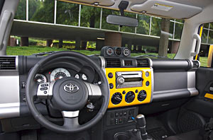 The interior of the FJ Cruiser is wild. Depending on what color you buy, the matching interior plastic pieces can be pretty darned bright. The styling is right out of Conceptville, with a tubular-shaped dash-top, lots of silver and gray plastic and rubber pieces and wonderful-feeling HVAC controls. Also catching your eye is the enormous shifter. It's huge!